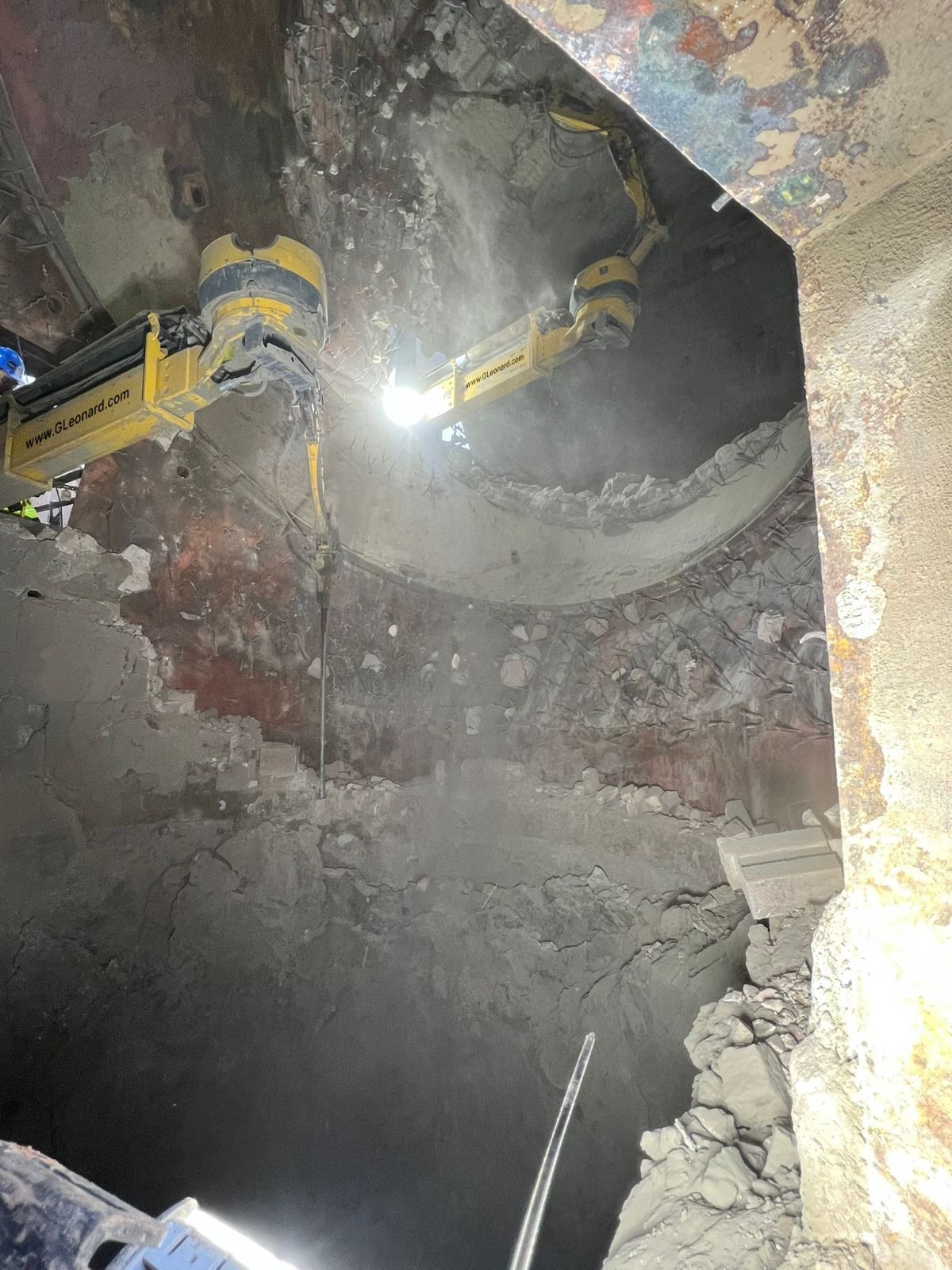 Congratulations to Holcim US INC. Devils Slide Plant and G Leonard North America INC. For partnering in the FIRST ever Robotic Arm Project in the United States of America This huge milestone shows the ultimate safety and efficiency benefits WE could provide at the same time for the Pyroclon Top Roof Demolition and C5 Refractory Panels Demolition shortly after Flame off